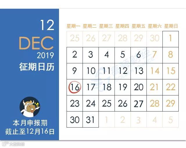 12月1日-16日申报缴纳增值税、消费税、城市维护建设税、教育费附加、地方教育附加、文化事业建设费、个人所得税、企业所得税、核定征收印花税