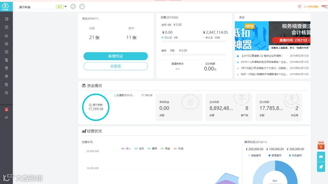 日记账智能导入、短信记日记账、银企互联、语音记账、自动记账、语音查账、微信分享日记账。发票 、银行对账单实现智能导入,无需调整表格,根据excel表头词向量、相似度,智能匹配 系统字段完成导入。10种财务报表一应俱全,总账、明细表、余额表、凭证汇总表。自动出具现金流量表,随时管控公司财务。