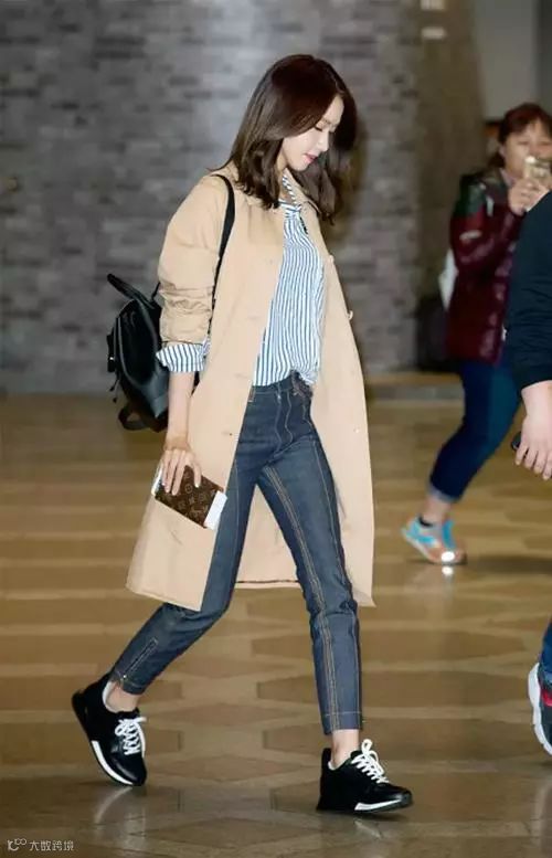 风衣+牛仔裤/紧身裤,可以选择略宽松版型的风衣,搭配紧身裤,“上大下小”的视觉很显瘦显腿细。
