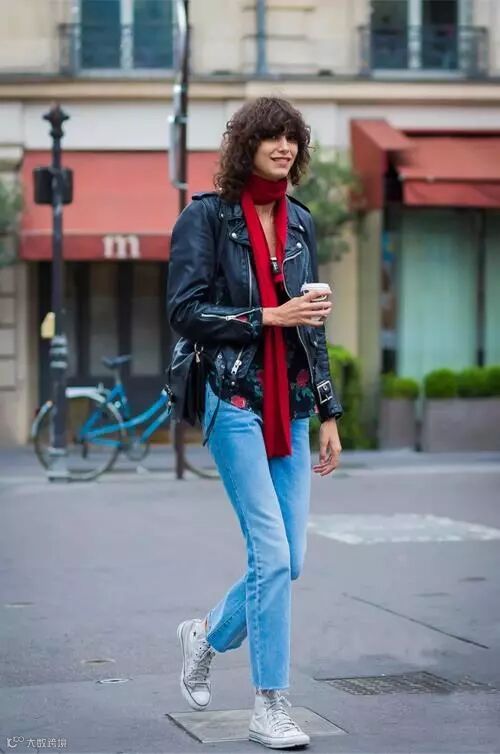 皮衣+牛仔裤,自带摇滚范有木有~再配双高帮帆布鞋就完美了。
