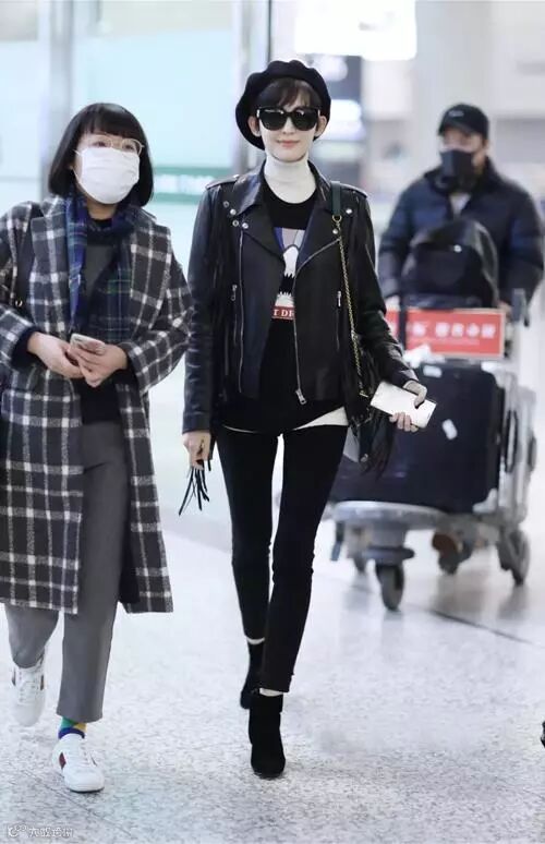 皮衣+小黑裤也是比较经典的穿搭,内搭T恤或者衬衫都OK。