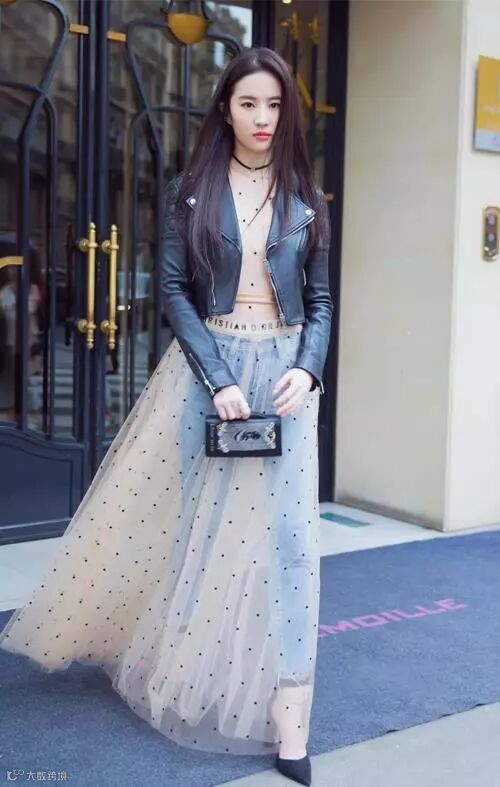 最后,皮衣+裙装的搭配很娘man结合,酷甜十足。皮衣搭配纱裙刚柔并济,搭配印花长裙风情十足。