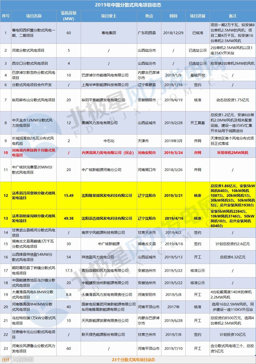 2018年在国家政策加持下,分散式风电曾一度火热呈燎原之势,后回归冷静。而随着风电平价时代到来,2019年风电上网电价新政的实施,或又带起了一股分散式风电浪潮。2019年,分散式风电项目签约、核准、开工频繁,据不完全统计有23个分散式风电项目动态,装机总量为468.17MW。以下为详情:
