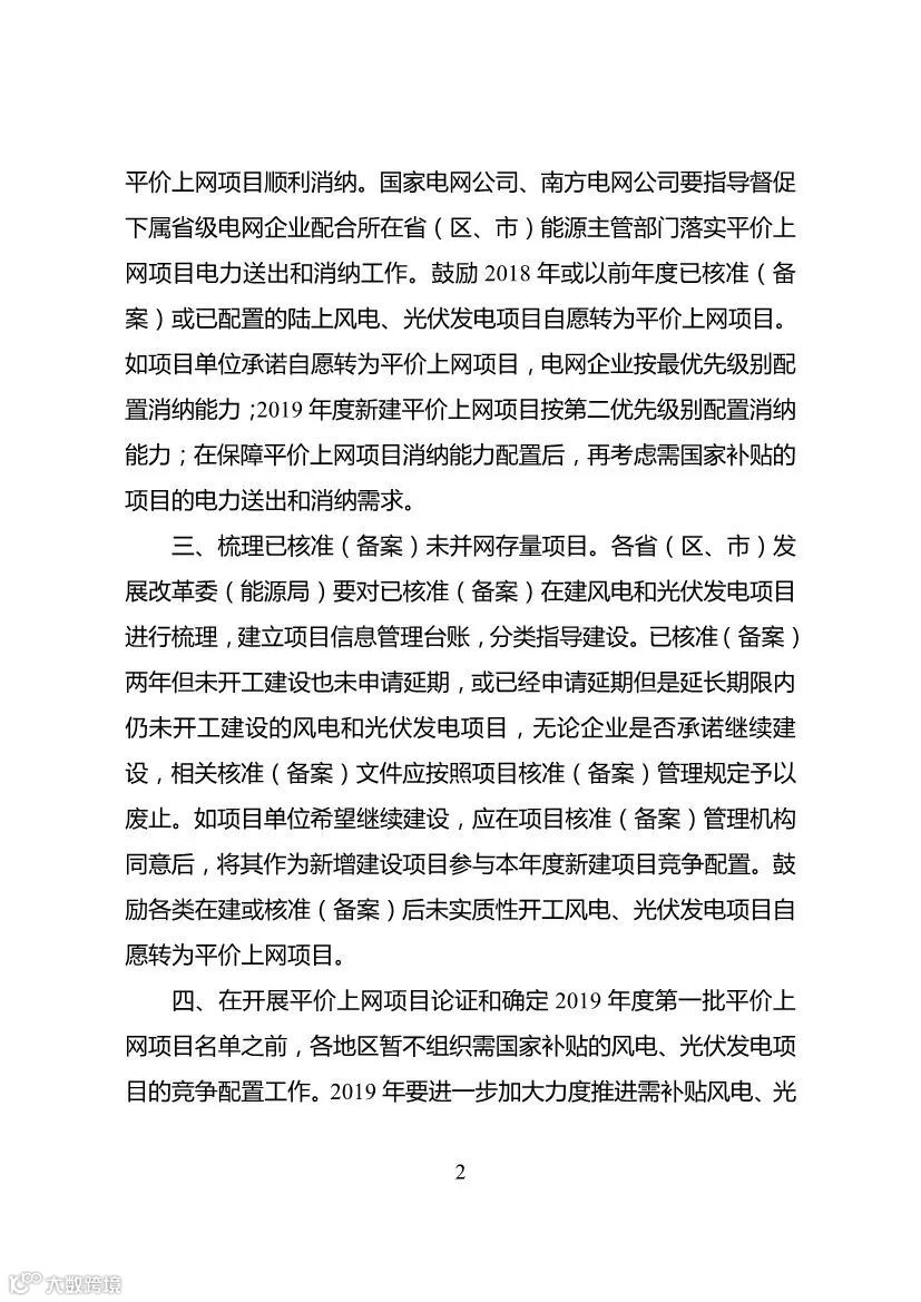 四、在开展平价上网项目论证和确定2019年度第一批平价上网项目名单之前,各地区暂不组织需国家补贴的风电、光伏发电项目的竞争配置工作。2019年要进一步加大力度推进需补贴风电、光伏发电项目竞争配置,有关要求国家能源局将另行发布。