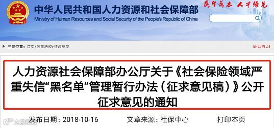2018年10月16日,人社部官网发布《社会保险领域严重失信“黑名单”管理暂行办法(征求意见稿)》(以下简称征求意见稿)。