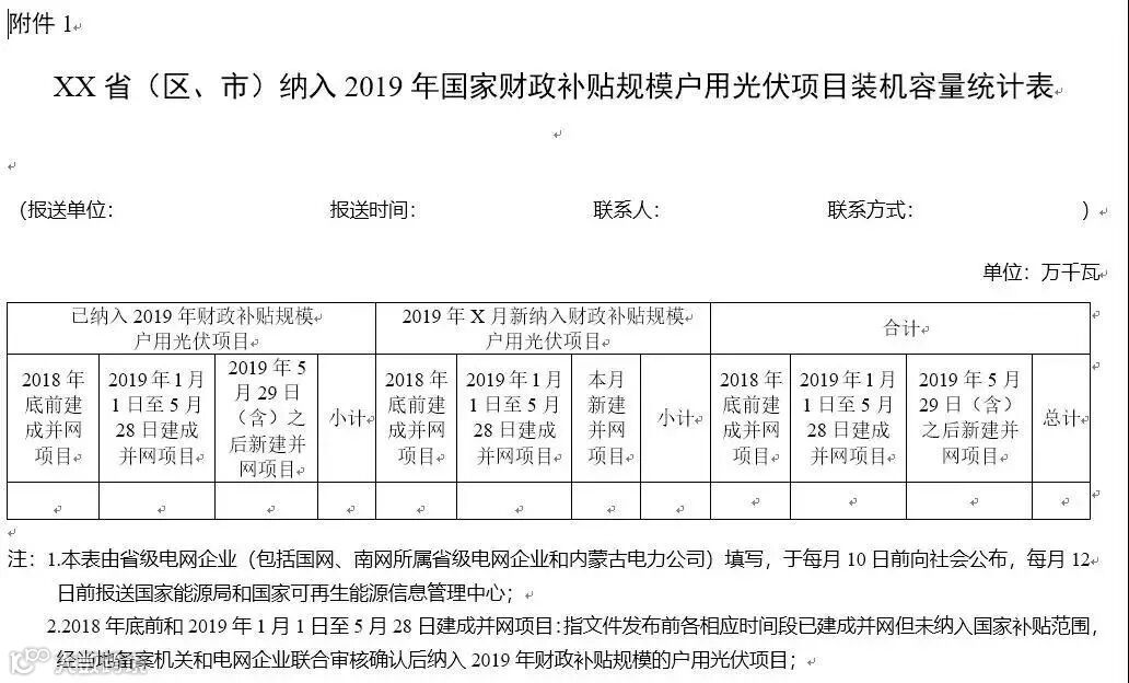 附件:1. XX省(区、市)纳入2019年国家财政补贴规模户用光伏项目装机容量统计表