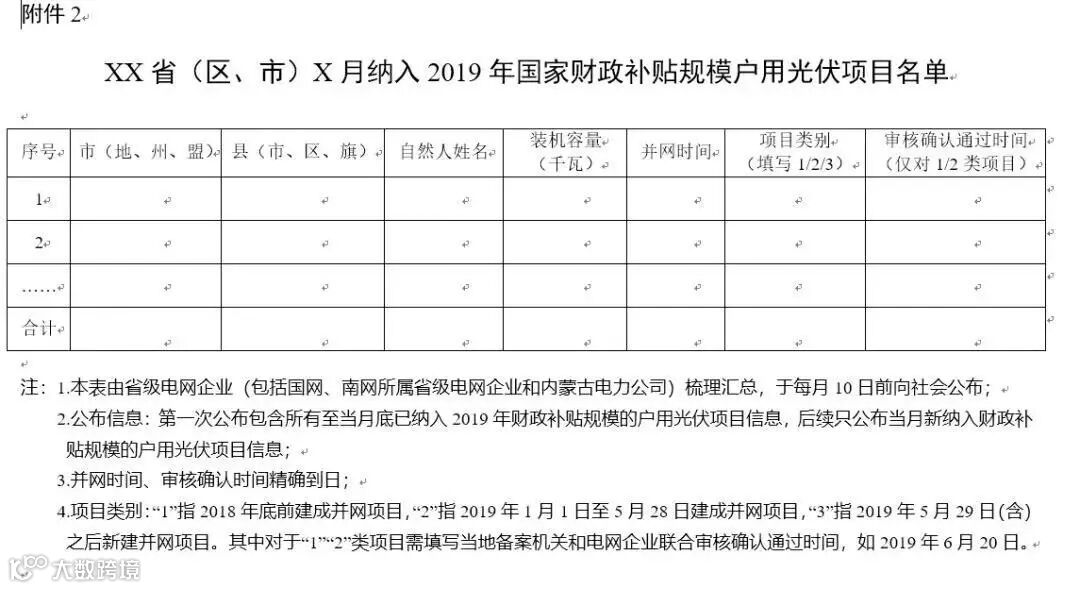 三、请相关省级能源主管部门组织地方电网企业于每月8日前按附件1、2向国网、南网所属省级电网企业和内蒙古电力公司报送户用光伏项目信息。各省级电网企业(含内蒙古电力公司)于每月10日前按附件1、2公布汇总后的全省户用光伏项目信息,并于每月12日前按附件1报送国家能源局,并抄国家可再生能源信息管理中心。2019年第一次信息公布和报送从7月开始,以后按月定期公布和报送信息。