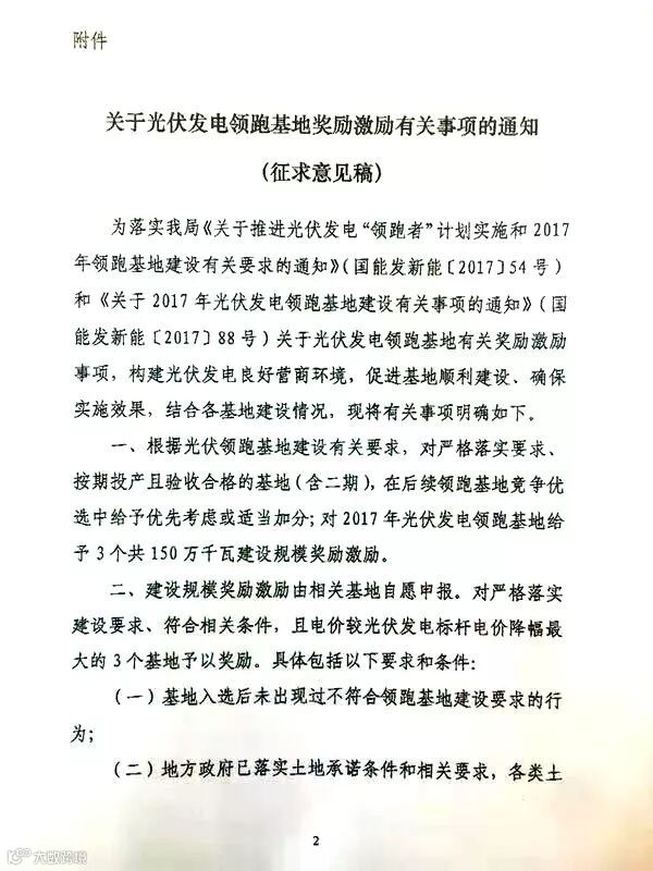 日前,国家能源局综合司印发征求《关于光伏发电领跑基地奖励有关事项的通知》意见的函(以下简称“《通知》”),就国能发新能【2017】54号中提出的领跑者基地奖励事宜征求相关发改委(能源局)的意见。