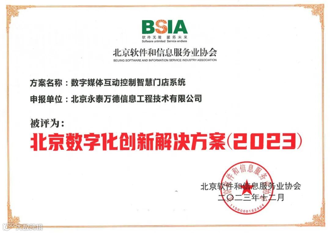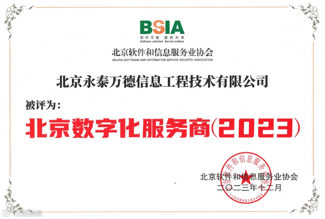 北京市经信局数字经济促进中心与北京软件和信息服务业协会联合发布奖项评选结果:永泰万德获得“北京数字化服务商(2023)”和“北京数字化创新解决方案(2023)”两项荣誉。