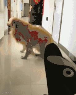 金毛见情况不妙,立刻急刹,赶紧掉头返回。