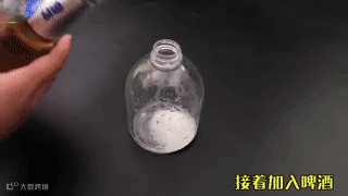 2、接着加入啤酒,食盐加上啤酒会发生反应,拧好盖子,摇一摇溶解,这样一个强力清洁剂就完成啦。