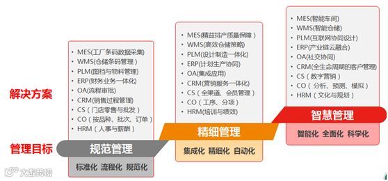 用友网络高级副总裁徐洋表示,企业数字化升级目标是实现持续化发展,成长型企业数字化建设发展过程中往往会经历规范管理阶段、精细管理阶段、智慧管理阶段三个阶段,不同的阶段的管理重点不同,在规范阶段主要是追求内部管理的标准化、规范化和流程化,在企业完成内部规范管理之后,企业会发展到精细管理阶段将信息化手段应用到业务细节中,在之后企业往往会发展到智慧阶段,企业运用互联网技术及云平台及大量的智能技术将管理延展到产业链上、下游,保障企业竞争的优势地位。