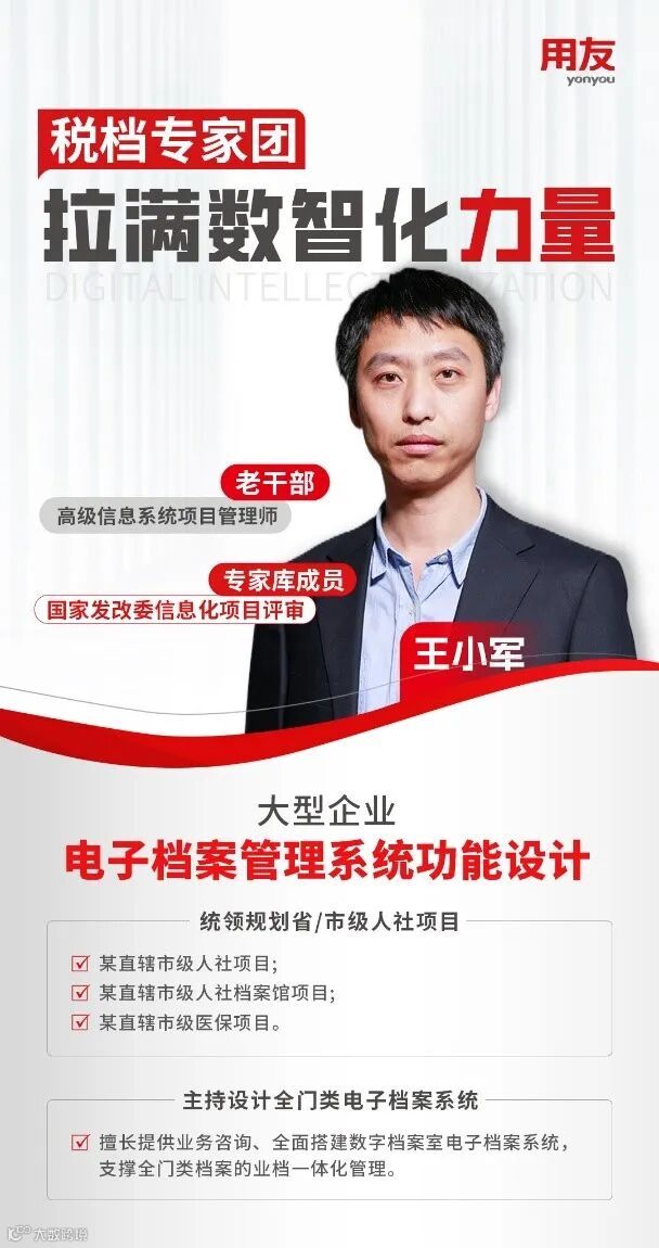 用友这支“装备精良”的税档专家团,人人身怀绝技、个个久战沙场,从产品到服务,致力于以“创新智慧管理、强化风险管控、提升工作效率、信息实时共享、助力科学决策”为目标,积极建立智慧税务新标杆,打造电子会计档案管理新高地!