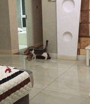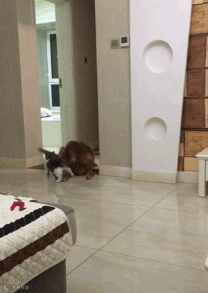 大金毛正躺在地上休息,这时猫咪路过,伸了伸后腿,放了个臭屁,直接把狗子给熏醒了...