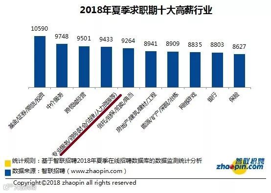 • 2018年夏季十大高薪行业/职业,专业服务/咨询(财会/法律/人力资源等)平均薪酬9433元排在第四位
