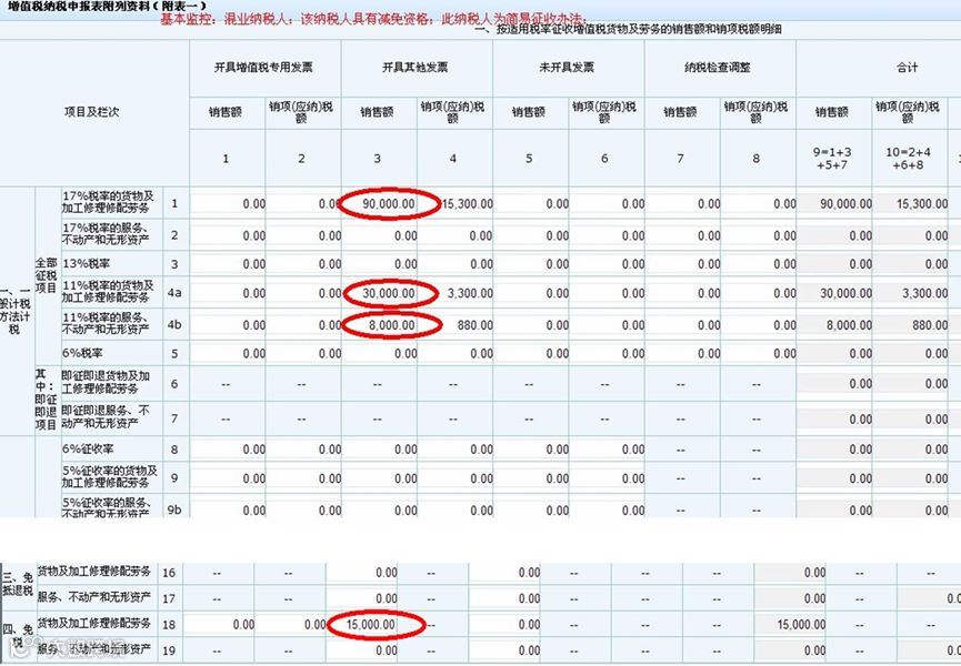 例:某超市取得的销售收入均开具增值税普通发票,申报时取得的销售大米、食品油需填写入附表一第4a栏(11%税率的货物及加工修理修配劳务),而取得的停车费收入填入4b栏(11%税率的服务、不动产和无形资产)。若当月申报时,未按4a,4b区分填写,全部填入同一栏次,且总金额一致,则企业当月网报可通过系统比对,但在次月网报时系统会提示错误,原因是因为未正确区分征税项目,需到税务机关更正申报表后,才能进行申报。