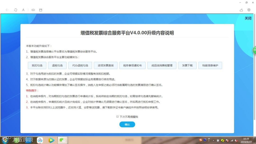 进入下图界面,仔细阅读升级内容说明后点击“确认”。