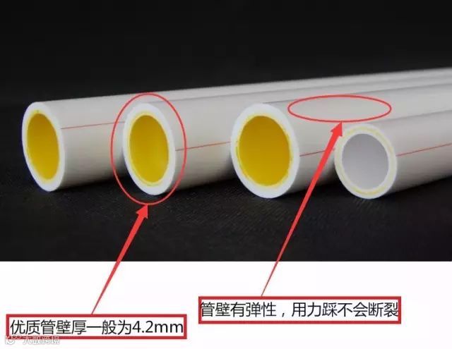 ▲水管属于隐蔽工程材料,所以装修完是看不到的。水管质量也直接影响到日常生活。常用的水管材料是PPR管,无毒、耐压、耐腐蚀。好的PPR水管的使用寿命可在50年以上,而劣质水管只有1-5年。好管呈白色不透明,两头切管很整齐,没有毛刺,管壁厚薄均匀。