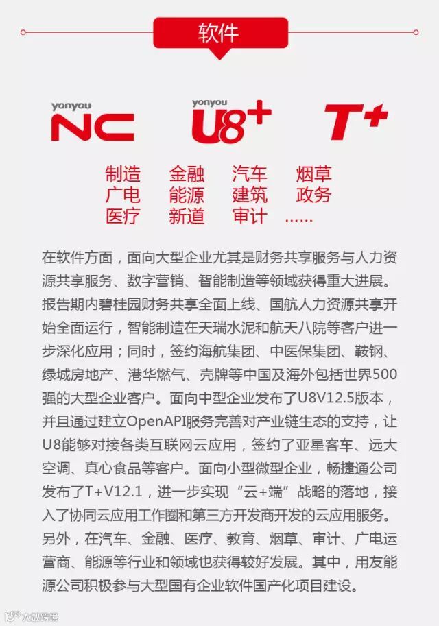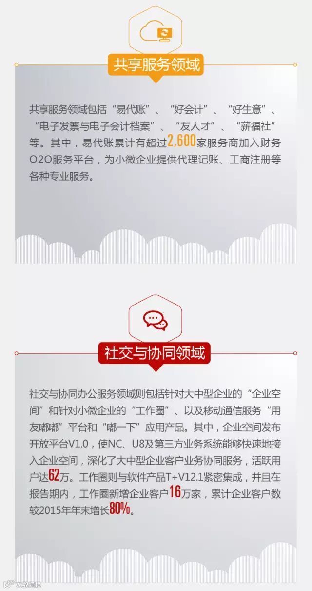 九江友信科技用友网络科技股份有限公司(600588)发布2016年上半年财报,营收增长14.8%,软件、云服务和金融服务均获得快速增长。其中软件同比收入增长10.0%;云服务实现收入4082.95万元,同比增长200.6%;金融服务实现收入7175.33万元,同比增长224.2%。