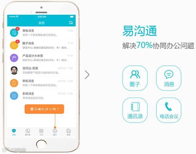工作圈从易办公、易沟通、易集成三个维度,诠释了“基于数据驱动”的协同办公模式,对人员管理、财务管理、进销存管理、客户管理进行全方位的把握。