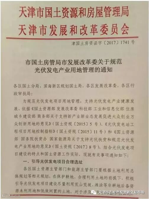 2017年12月11日,天津市国土资源和房屋管理局、天津市发改委联合发布《关于规范光伏发电产业用地管理的通知》,对天津市光伏用地进行进一步的明确。文件指出,“对光伏复合项目,光伏方阵架设在一般耕地或其他农用地上的,光伏组件最低沿应高于地面2.5米,应高于最低水位0.6米;桩基间列间距大于4米,行间距应大于6.5米”,这意味着天津市在光伏复合项目用地方面放宽了限制。