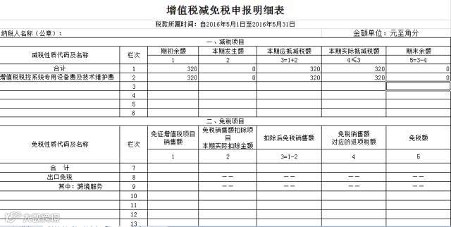 2. 将本期发生的820元增值税税控系统专用设备费及技术维护费分别填入《增值税减免税申报明细表》第1、2行第2、3列;本期实际抵减税额500元分别填入第1、2行第4列;未抵完的余额320元分别填入第1、2行第5列。