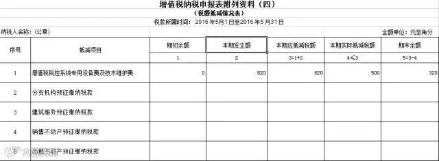 1.将本期发生的820元增值税税控系统专用设备费及技术维护费填入《增值税纳税申报表附列资料(四)》第1行第2、3列;本期实际抵减税额500元填入第1行第4列(因本期应纳税额500元,小于本期应抵减税额820元,因此本期实际抵减税额为500元);未抵完的余额320元填入第1行第5列。