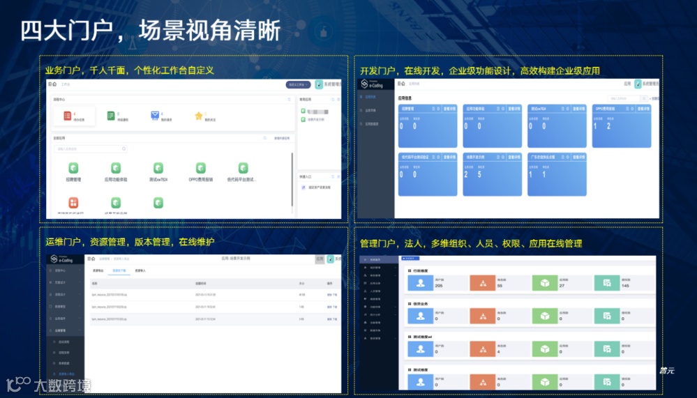 (2)开发门户,支持在线开发,提供企业级功能设计,高效构建企业级应用;