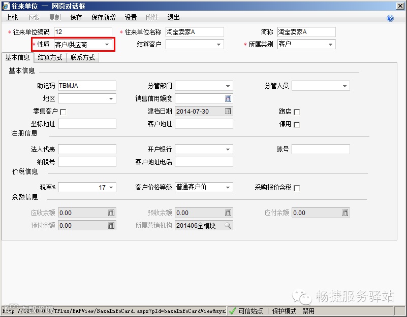 2、在“基础设置”-“常用信息设置”-“往来单位”新增卖家档案,“性质”选择“客户/供应商”