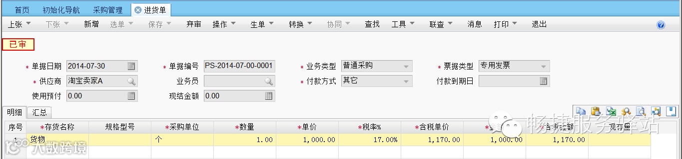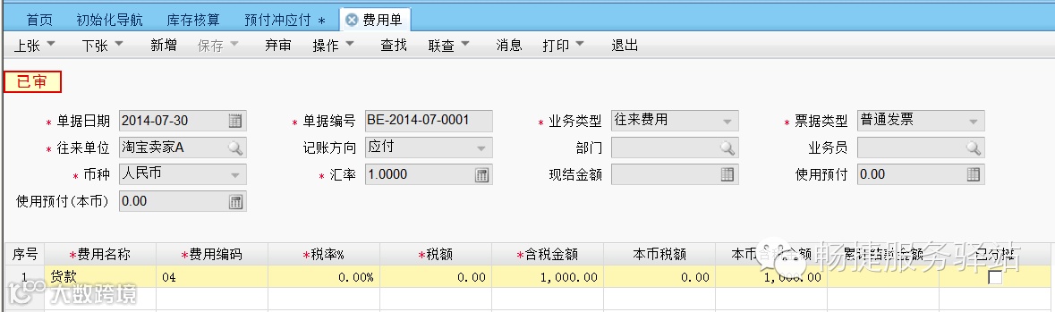 再填制往来费用单,形成对卖家的应付账款,金额为货款金额