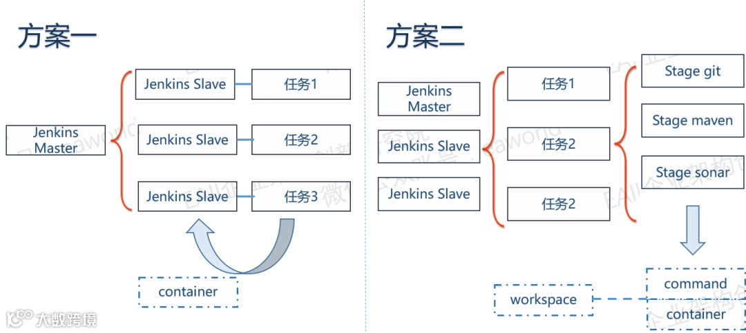 方案2:jenkins的管理节点和slave节点仍然运行在主机环境,只将任务具体stage中最终形成的执行命令使用容器运行,任务中执行命令的容器挂载同一个workspace空间。如stage git最终形成了一条命令git pull http://test.project.git。使用包含git工具的容器镜像运行这条命令将代码拉取到挂载的workspace中,stage maven生成的命令maven clean install则使用包含maven构建环境的容器镜像执行即可。