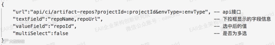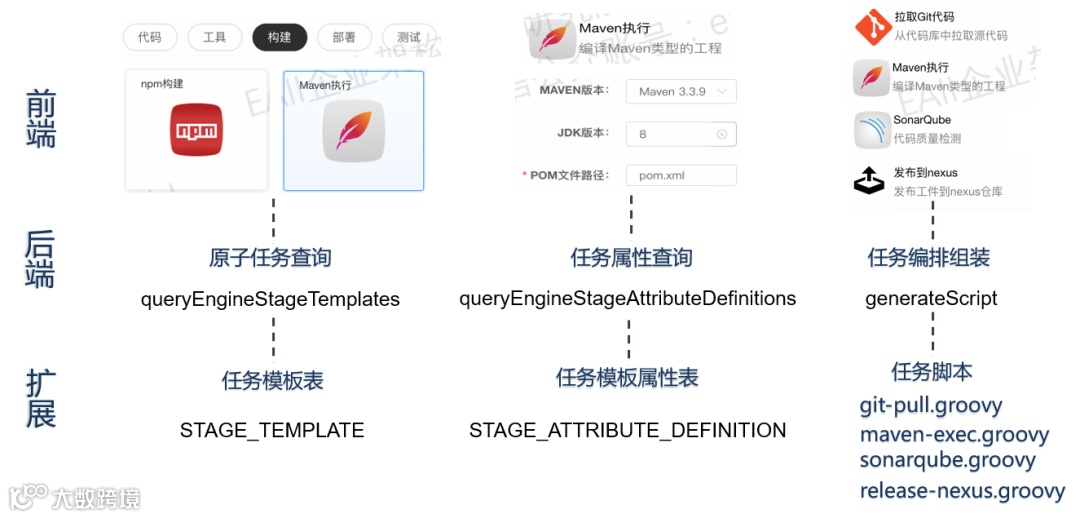 属性定义:设计任务参数,如maven构建任务,构建依赖的jdk版本,构建所使用的pom文件路径等。同时配置参数对应的前端控件(如checkbox,select,password等),若使用select框则需要定义展示数据的来源,可以是api和业务字典等。