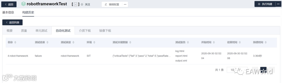2)robotframework任务执行完毕后,点击进入“自动化测试”tab页,显示本次运行相关信息(包括测试环境、运行开始结束以及持续时间)和测试报告、日志链接。
