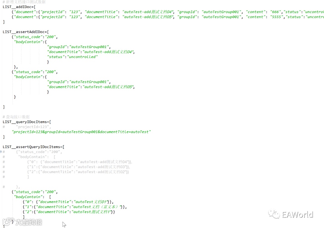 Py文件 : LIST__addIDoc为新增接口的测试数据,其校验数据对应为:LIST__assertAddIDoc。.py文件中存储list类型数据,作为“增”[post]接口的测试数据以及各接口的校验数据;如图所示,其中“删改查”[delete/put/get]接口的校验数据需根据sql中的数据进行设计,一条测试数据对应一条校验数据,其List下标相同,保证进行数据遍历时测试数据和校验数据能一一对应。