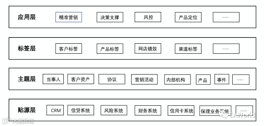 我们认为数据中台建设,至少应该包含应用、标签、主题、贴源这4个层级结构。