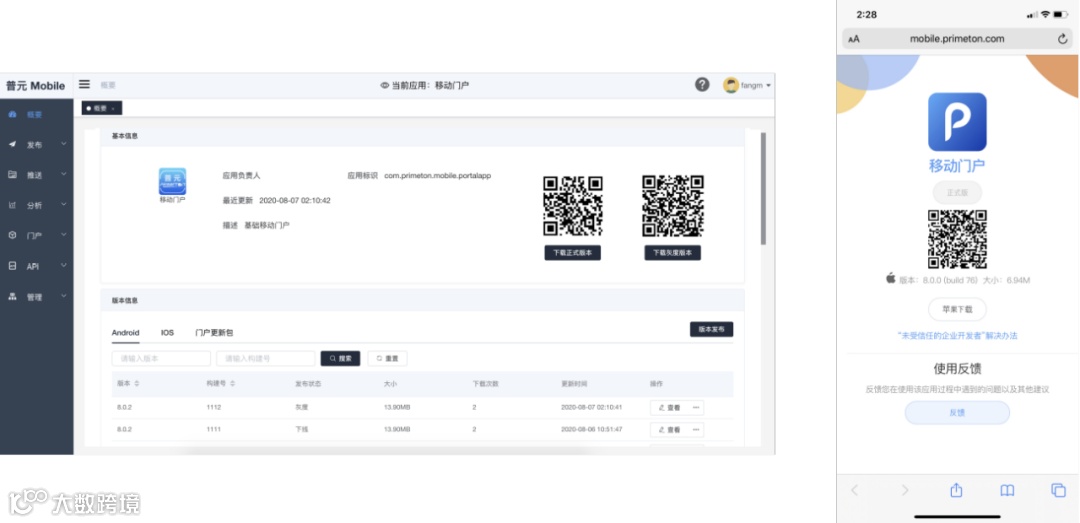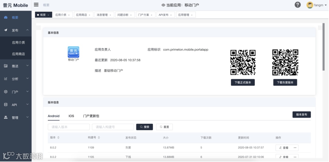 普元移动门户管理平台不但提供了移动应用的更新、发布等功能,还提供了应用的上传、下载、二维码下载等能力。上传功能和DevOps打通,在编译成功后直接发布到应用商店中,开发测试人员可以直接扫码下载最新的App,实现开发测试流程的闭环。