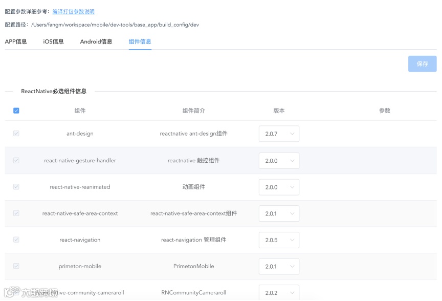 在移动8.0GA产品中,我们提供了60多个组件,可以在配置打包信息时看到并勾选使用。组件包括ReactNative最常用到的导航组件、UI组件、ReactNativeCommunity社区提供的优秀的组件等,还有二维码、视频、音频、H5等支持。企业也可以将自己集成的组件发布到组件仓库中,形成组件资产的积累。