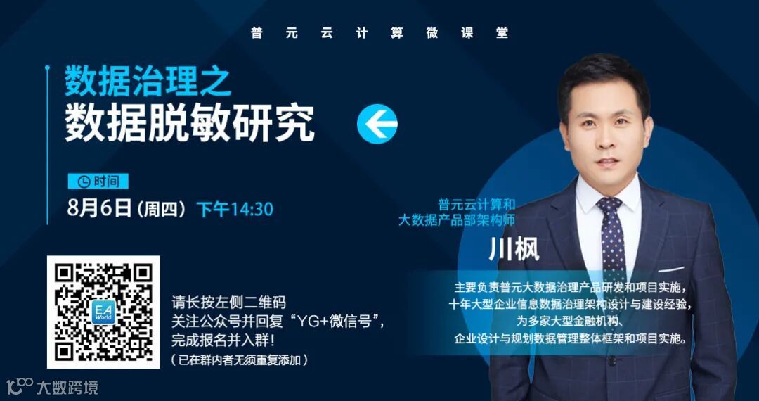 课程预告!8月6日(周四)下午14:30普元云计算和大数据产品部架构师川枫为大家分享《数据治理之数据脱敏研究》,敬请期待!