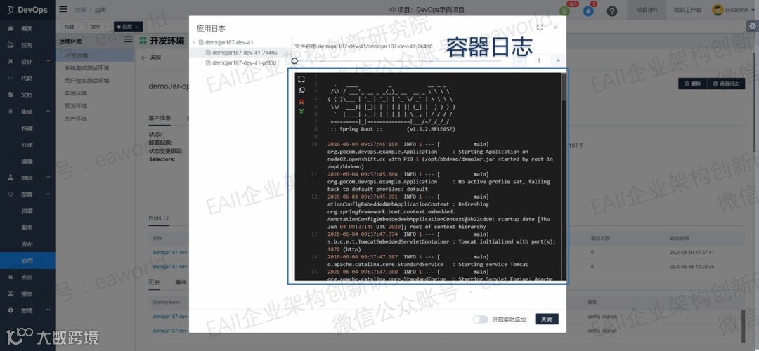 同时,DevOps在应用的界面提供了应用运维的一些基本能力,如应用的伸缩扩容、启动、停止、回滚,查看POD日志等。运维人员通过界面就能够获取到当前应用的详细信息,也可以很方便的进行应用的运维操作,这样可以大大减轻运维的压力。
