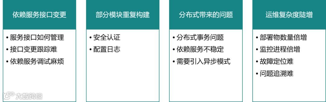 运维复杂度陡增,如:部署物数量多、监控进程多导致整体运维复杂度提升。