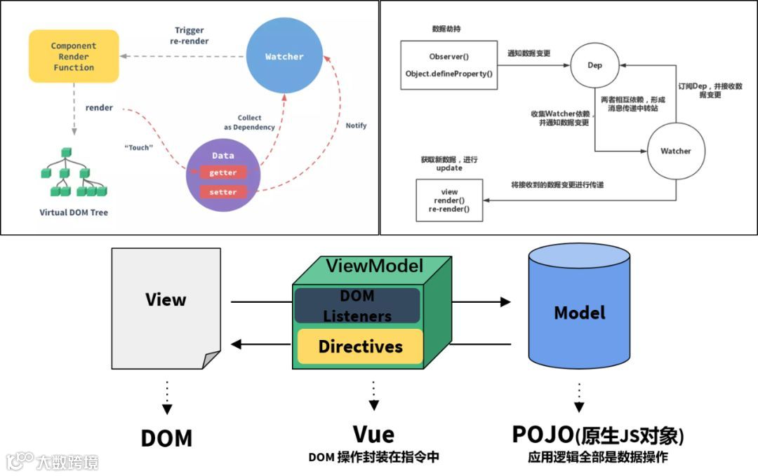 具体的来讲,Vue.js通过Directives指令去对DOM做封装,当数据发生变化,会通知指令去修改对应的DOM,数据驱动DOM的变化。vue.js还会对操作做一些监听(DOM Listener),当我们修改视图的时候,vue.js监听到这些变化,从而改变数据。这样就形成了数据的双向绑定。