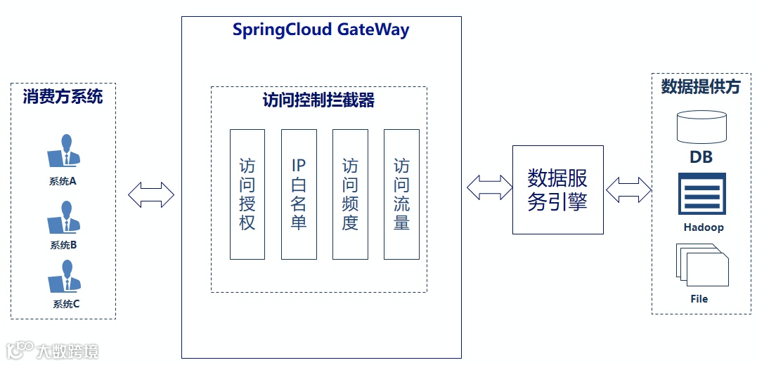 消费方系统通过SpringCloud Gateway访问数据服务,依次通过token授权、IP白名单、访问频度、访问流量多重拦截器进行控制,保证服务访问安全。