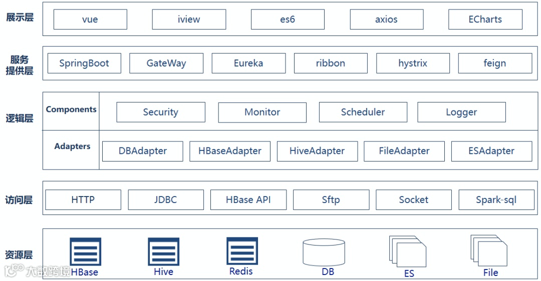 逻辑层:提供对资源层不同数据源的适配器,同时提供可重用的安全、监控、调度及日志组件。