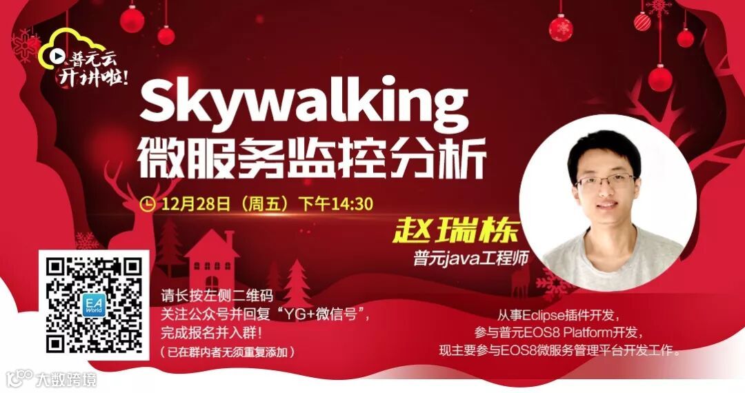 课程预告! 12月28日(周五)下午14:30普元Java工程师赵瑞栋为大家分享《Skywalking微服务监控分析》,在此公众号回复“YG+微信号”马上入群并完成报名!