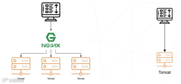 图中左侧为前后端分离的简易方案。具体部署时,通过nginx,可以进行负载均衡,同时可以部署多台nginx服务器。如果性能仍旧无法满足,则可以使用LVS+F5/LVS+Nginx等多种方式进行负载均衡。