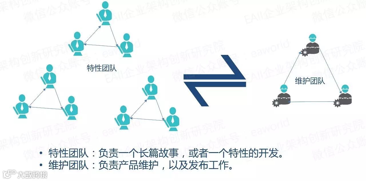 不超过10人的小团队被很多企业证明是一个良好的实践。可以让对的人去做擅长的事,如果团队过大很多人无法承担合适自己的角色也是一种浪费。另外随着持续交付的演进,产品总有新的需求,也有旧的问题。如何合理分配人员从而做到一石二鸟?一些组织开始将团队分为若干个特性团队和维护团队。这样能带来以下好处: