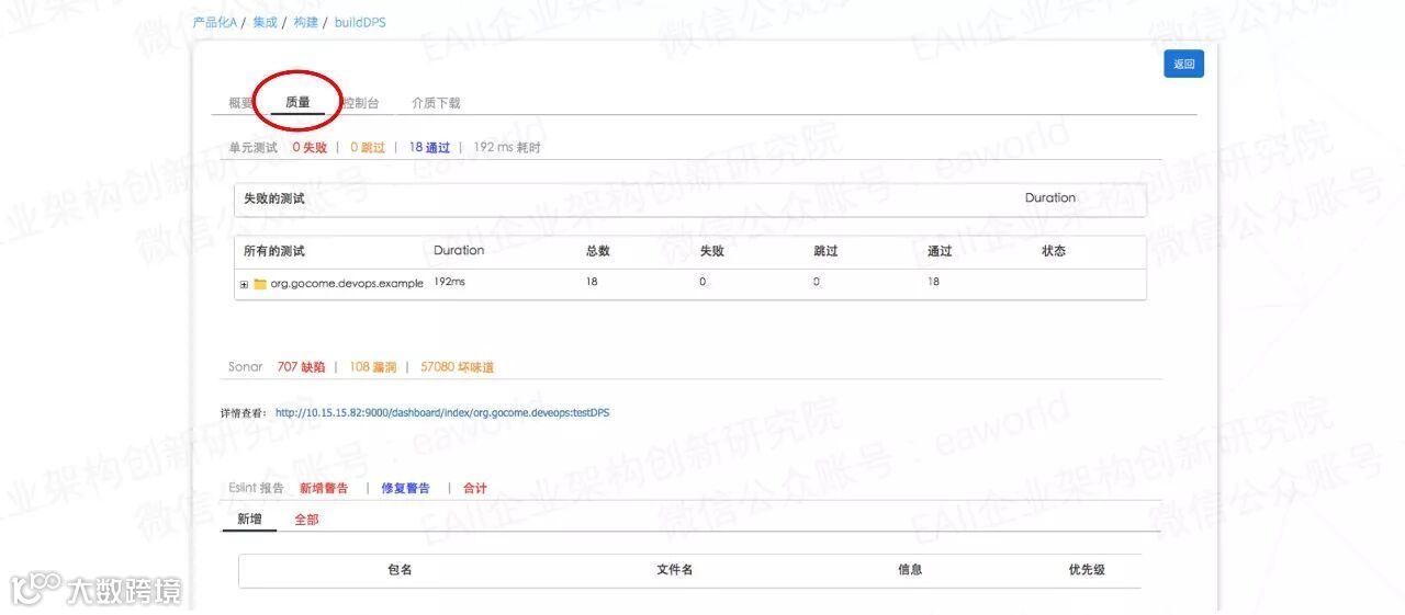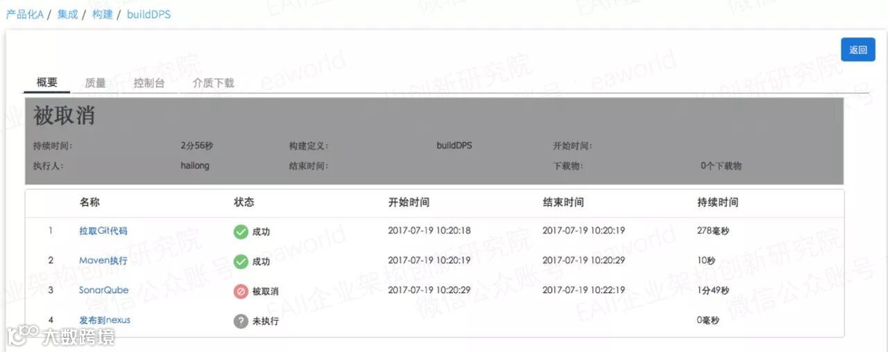 构建执行结束后,我们可以在DevOps中跟踪构建执行的情况、查看构建日志、查看质量报告,下载构建介质,跟踪构建历史。
