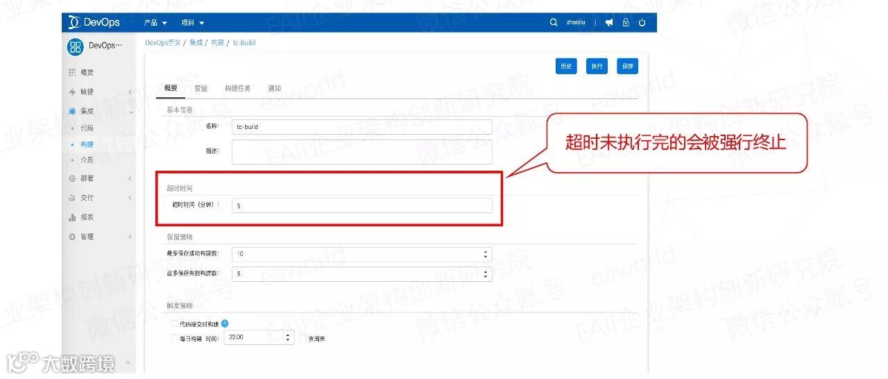 我们在DevOps中进行构建定义时,可以配置超时时间。这个超时时间是指在Jenkins中执行这个构建流程的时候,最长允许执行多长时间,如果超过这个时间,这个构建流程就会被Jenkins强行终止。