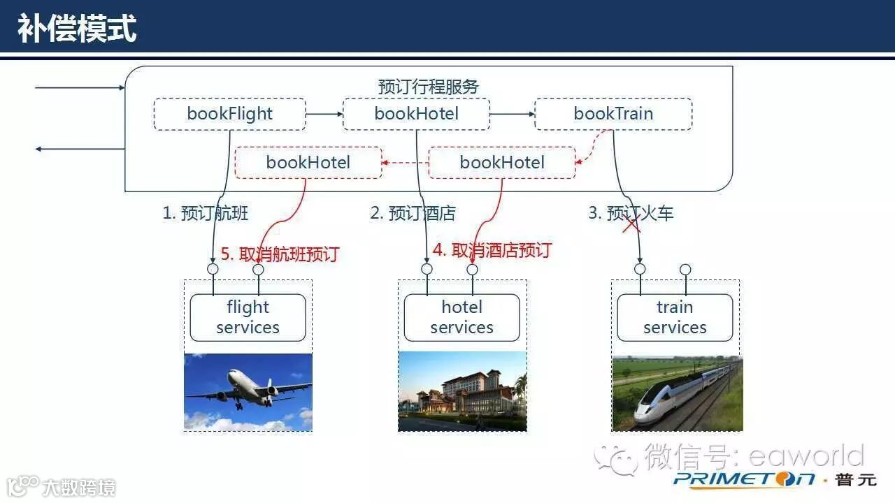 如果火车票预订服务没有调用成功,那么之前预订的航班、酒店都得取消。取消之前预订的酒店、航班即为补偿过程。
