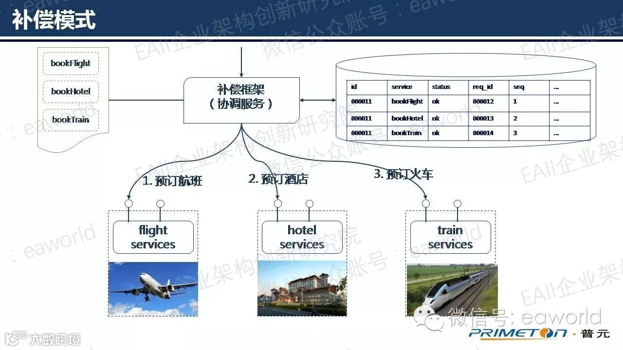 当客户的一个预订请求达到时,协调服务(补偿框架)为请求生成一个全局唯一的业务流水号。并在调用各个工作服务的同时记录完整的状态。